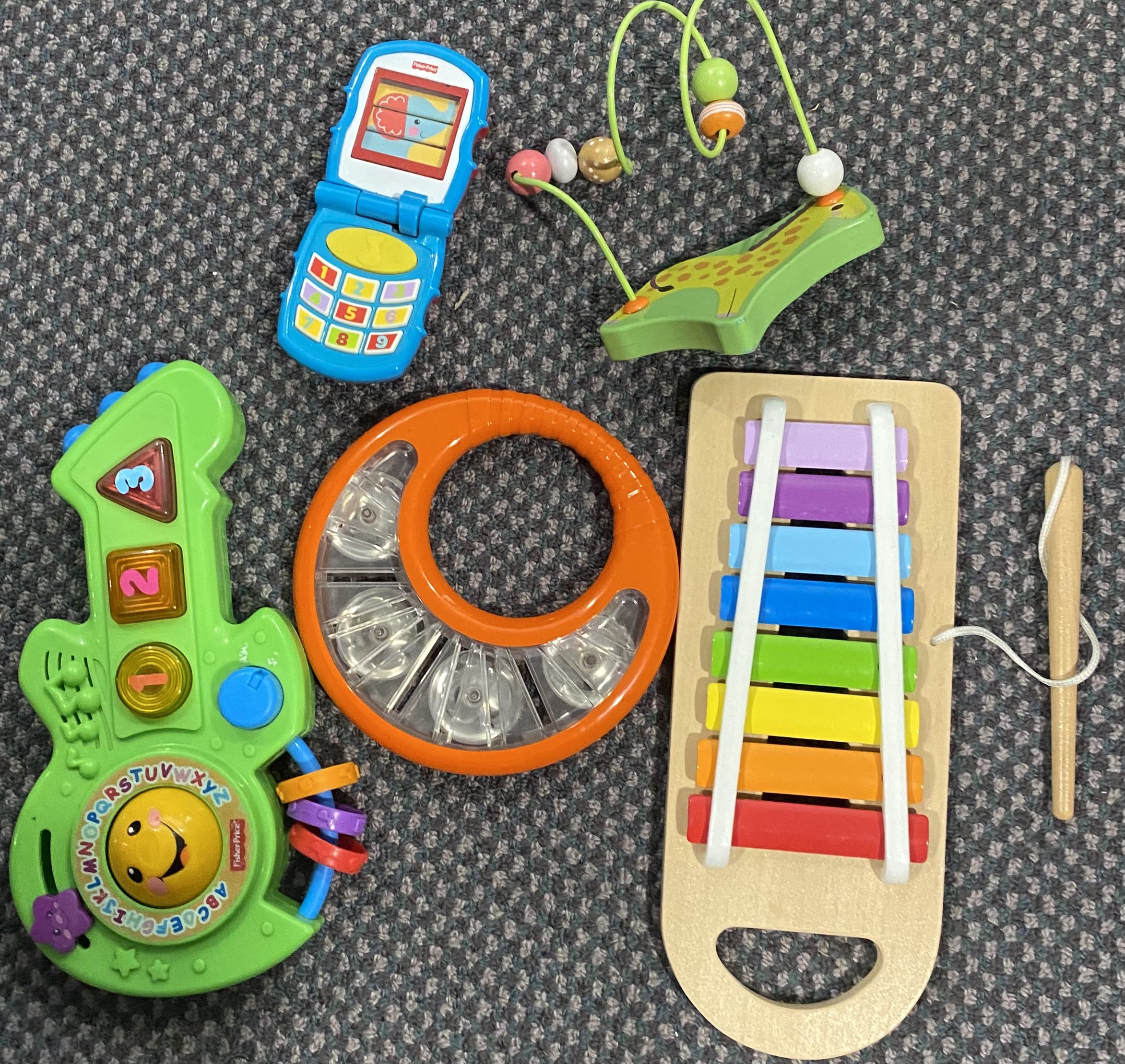 1 flip flop musical phone (doesn’t work) 1 xylophone with stick attached 1 bell shaker 1 giraffe bead activity 1 guitar 10L Sistema Container